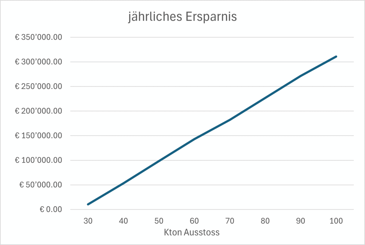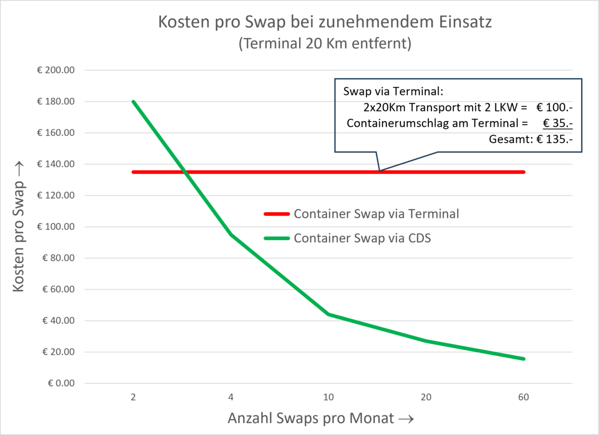 Wenn Sie den Chassiswechsel direkt und autonom auf Ihrem Hof machen, anstatt mit zwei LKWs zum 20 km entfernten Terminal zu fahren, haben Sie bei 3 Auswechslungen im Monat über die CDS bereits Kosteneinsparungen (siehe Grafik). Darüber hinaus ist die CDS-Lösung wesentlich einfacher und flexibler im Betrieb.
